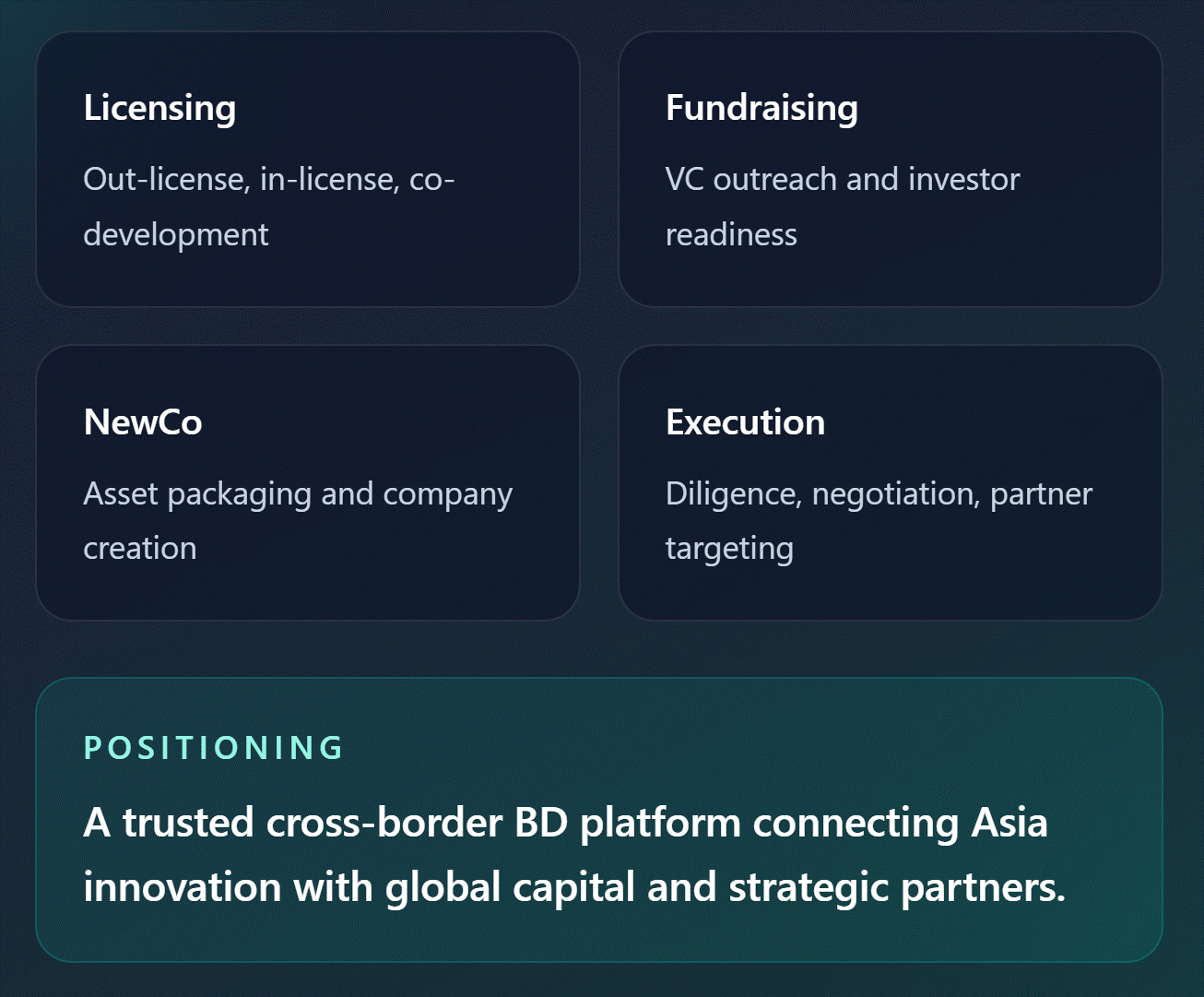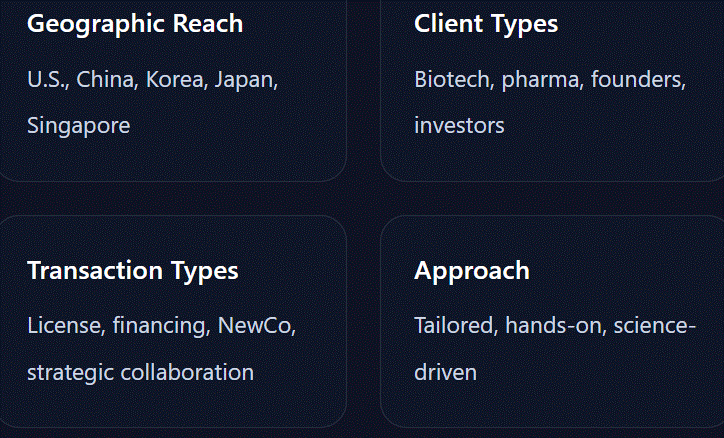 We help biotech and pharma companies unlock value through cross-border partnering, licensing, financing, and NewCo formation.